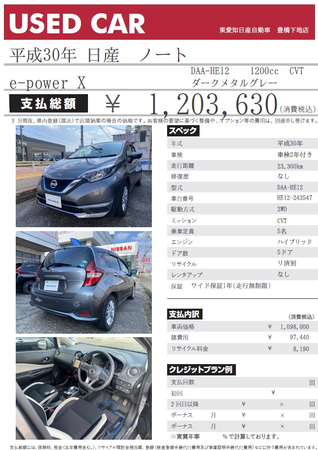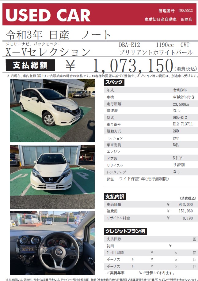 ノート X-Vセレクション ブリリアントホワイトパール 令和3年