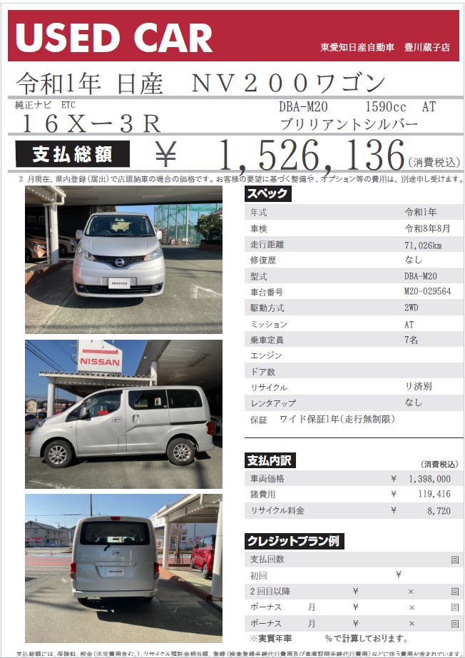 NV200ワゴン 16X-3R ブリリアントシルバー 令和元年