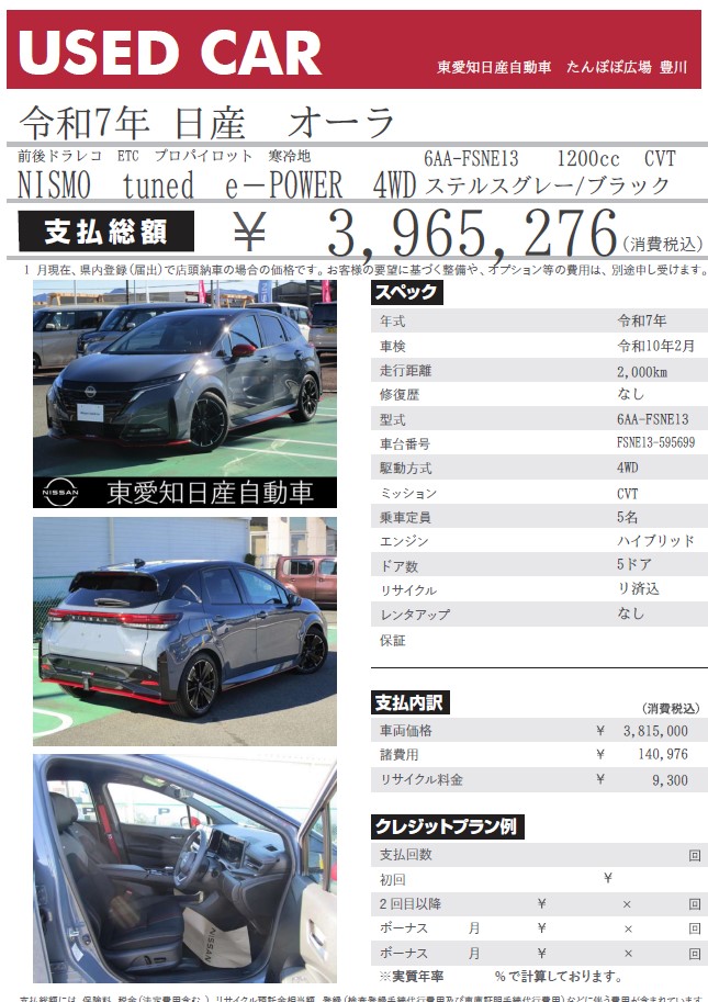 オーラNISMO tuned e-POWER 4WD ステルスグレー/ブラック 令和7年