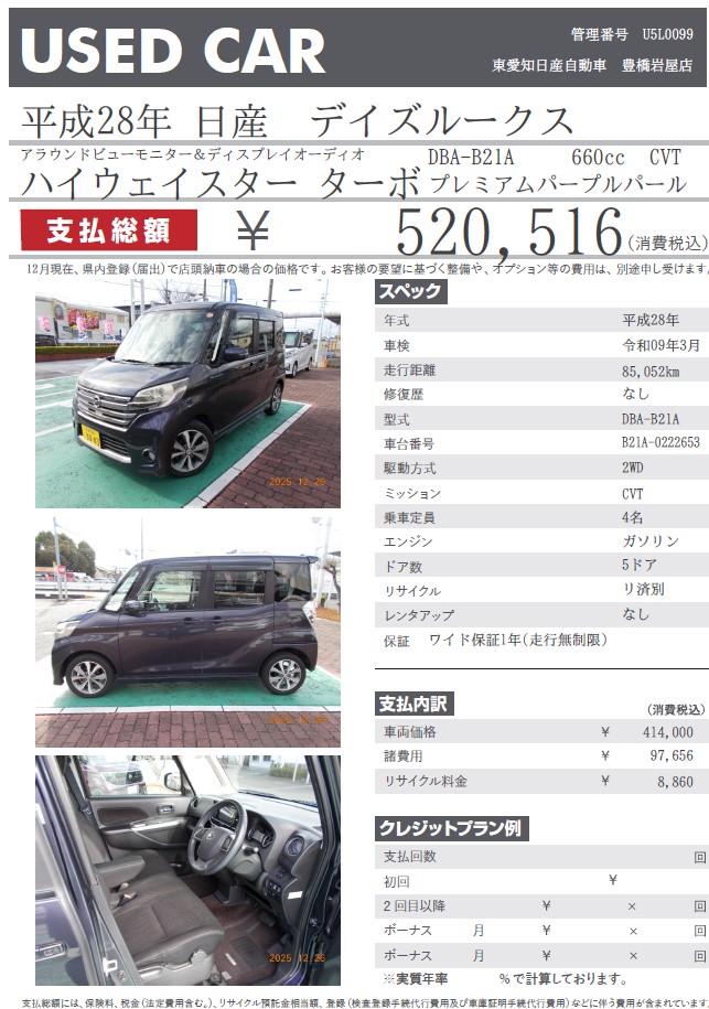 デイズルークス ハイウェイスター ターボ プレミアムパープルパール 平成28年