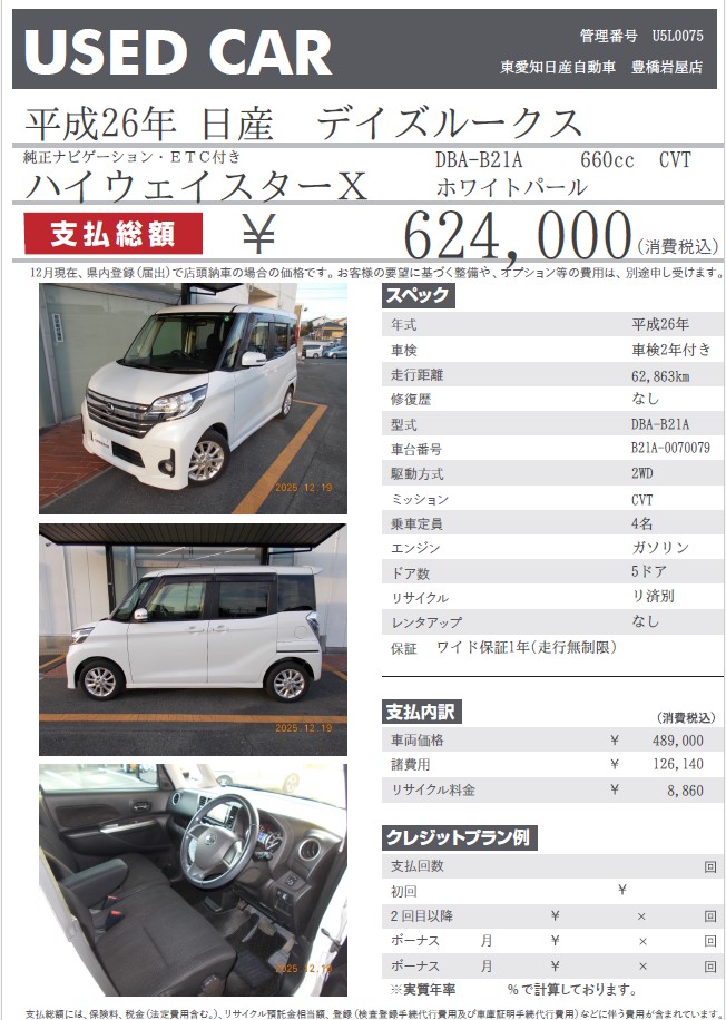 デイズルークス ハイウェイスターX ターボ ホワイトパール 平成26年