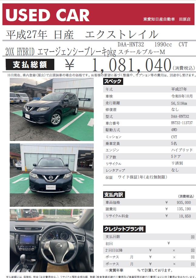 エクストレイル 20X HYBRID エマージェンシーブレーキpkg スチールブルー 平成27年