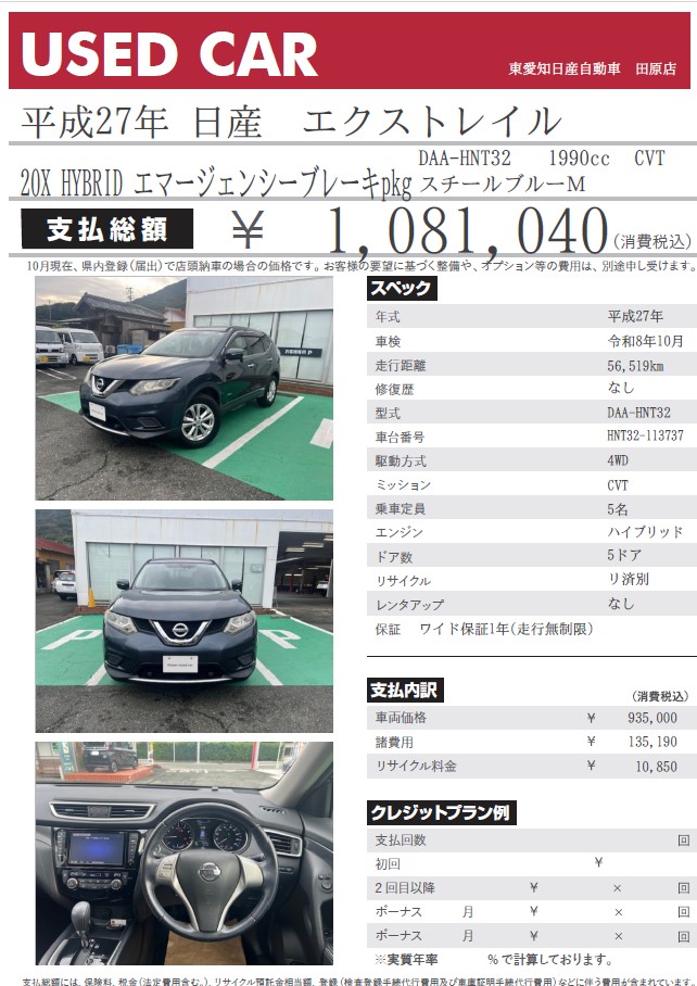 エクストレイル 20X HYBRID スチールブルー 平成27年