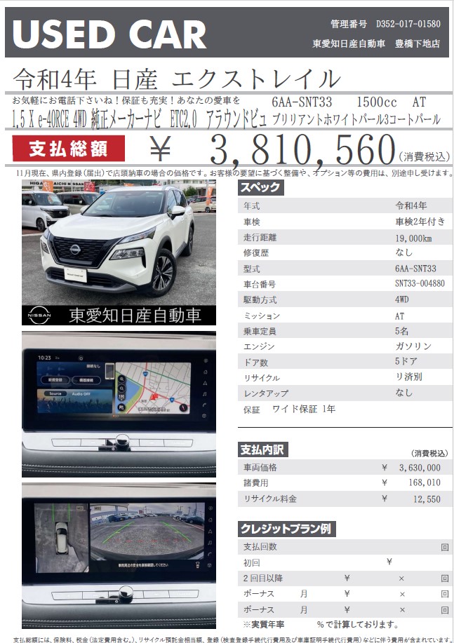 エクストレイル 1.5 X e-4ORCE 4WD ブリリアントホワイトパール 令和4年