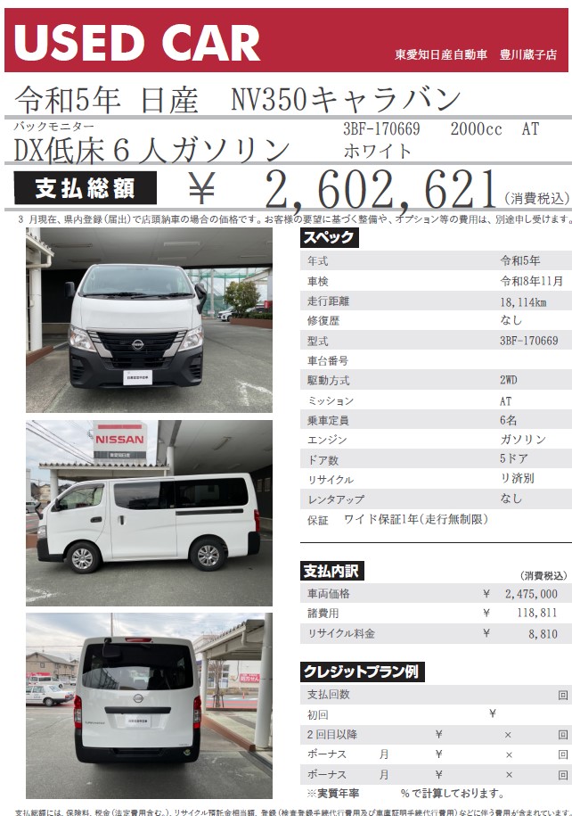キャラバン DX低床6人ガソリン ホワイト 令和5年