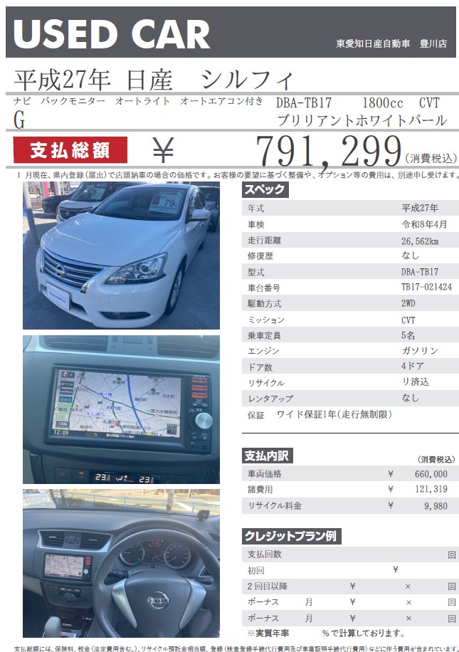 シルフィ G ブリリアントホワイトパール 平成27年